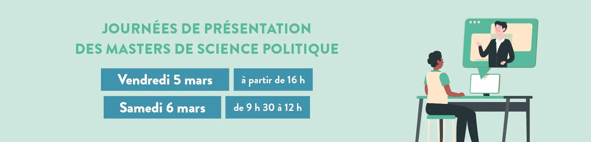Les Journées de présentation des Masters de Science politique se dérouleront à distance les 5 et 6 mars 2021. Nous invitons les candidats à suivre les visioconférences, regarder les vidéos de présentation, consulter les maquettes et les fiches de présentation des Masters.